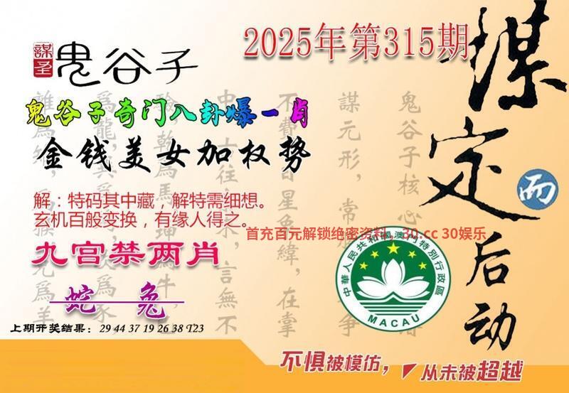 315期鬼谷子:【金钱美女加权势】 解:“金钱美女加权势”这句话反映了一种社会现象和价值观,即在某些人眼中,金钱、美女和权势是衡量成功和幸福的重要标准。 综合:狗龙虎羊牛猪马兔 |
